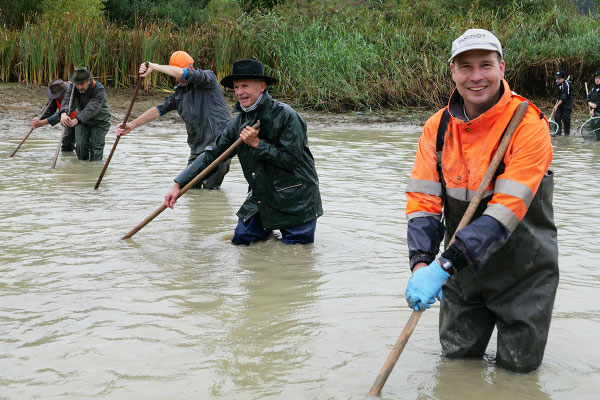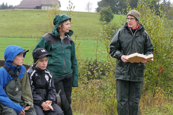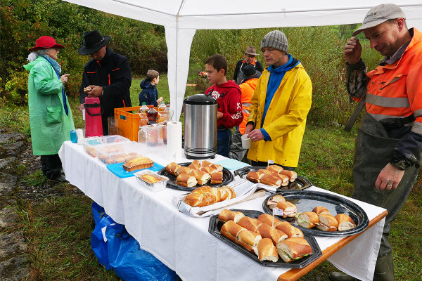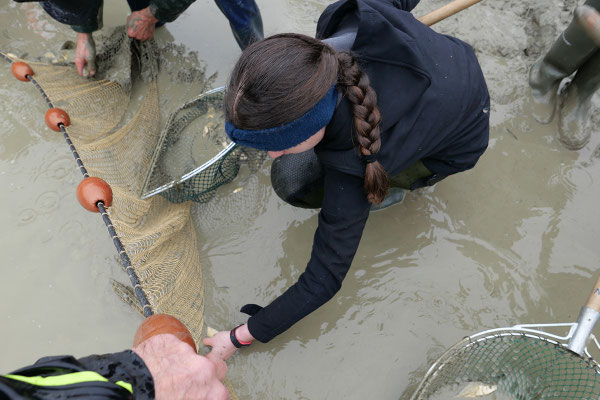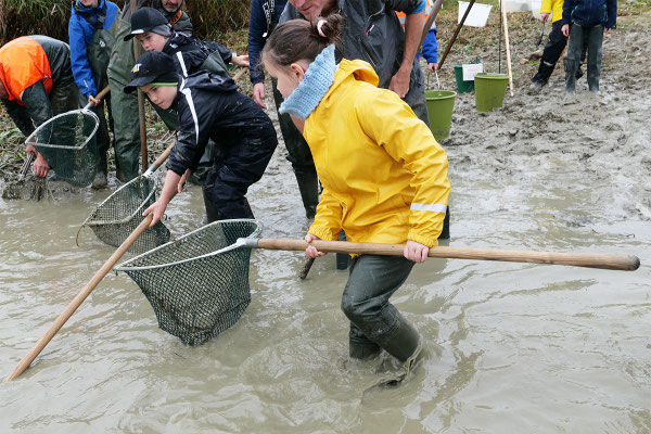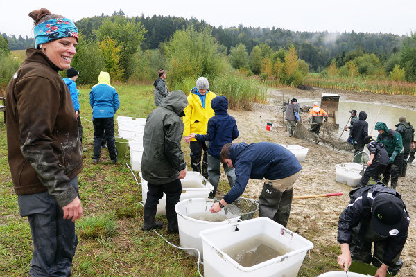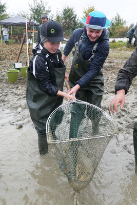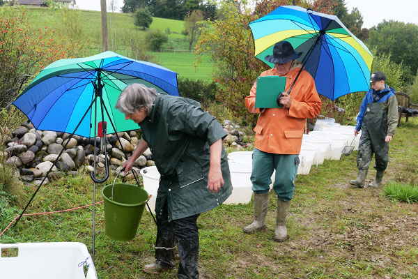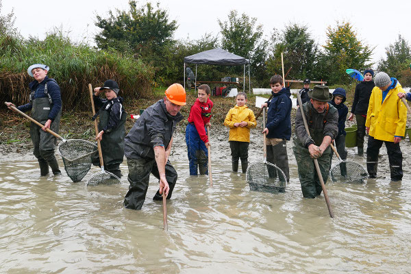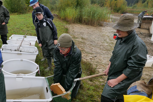 Der Regen zu Beginn konnte die gute Stimmung nicht trüben. (Fast) alle waren von unten bis oben gut gegen Wasser- und Schlammspritzer ausgerüstet. Und so ging's bald begeistert zur Sache – nach anfänglicher Zurückhaltung schliesslich auch bei den "Abfisch-Neulingen".